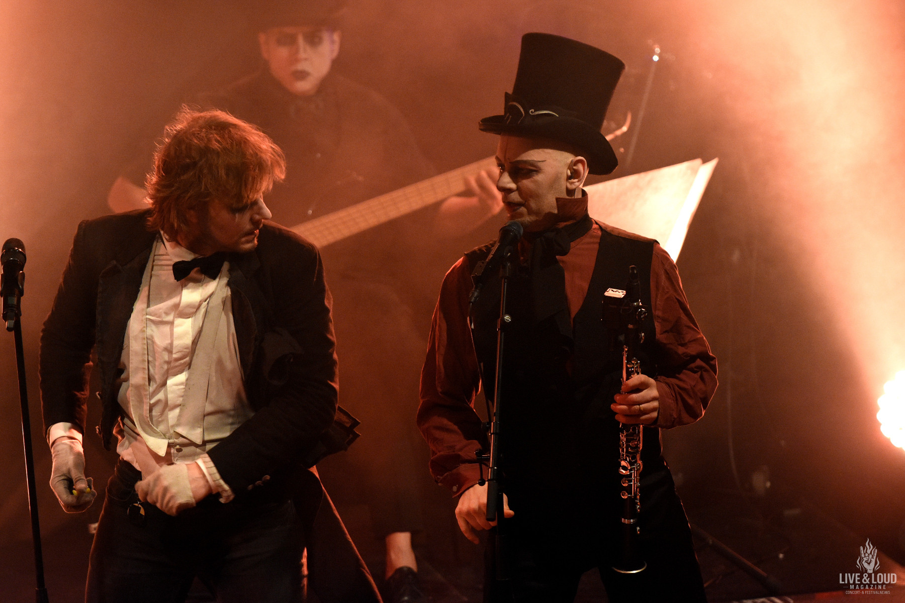 Die Bühne war bereitet für ein Spektakel, das sich jedem Genre-Schubladendenken entzieht. Coppelius starteten mit einer Präzision, die an ein Schweizer Uhrwerk erinnert – allerdings eines, das auf Hochtouren läuft und kurz vor der Explosion steht. Der Verzicht auf die Standard-Rock-Besetzung ist bei dieser Band längst kein Gimmick mehr, sondern ein Statement. Wenn der Kontrabass mit einer Aggressivität bearbeitet wird, die man sonst nur von Slap-Bass-Legenden kennt, und die Klarinetten wie verzerrte Lead-Gitarren durch die PA schneiden, dann ist das Handwerk auf höchstem Niveau.