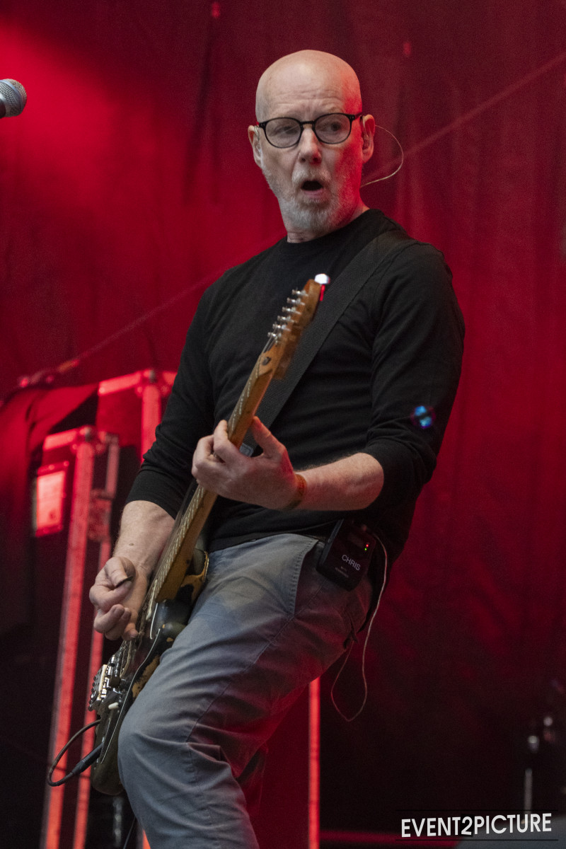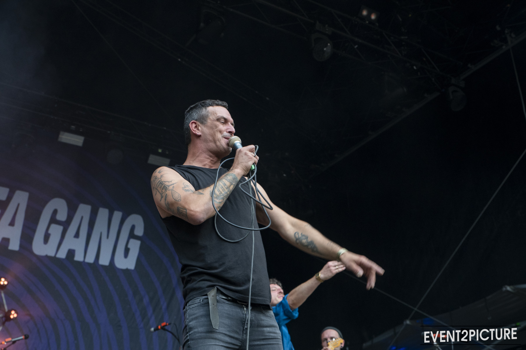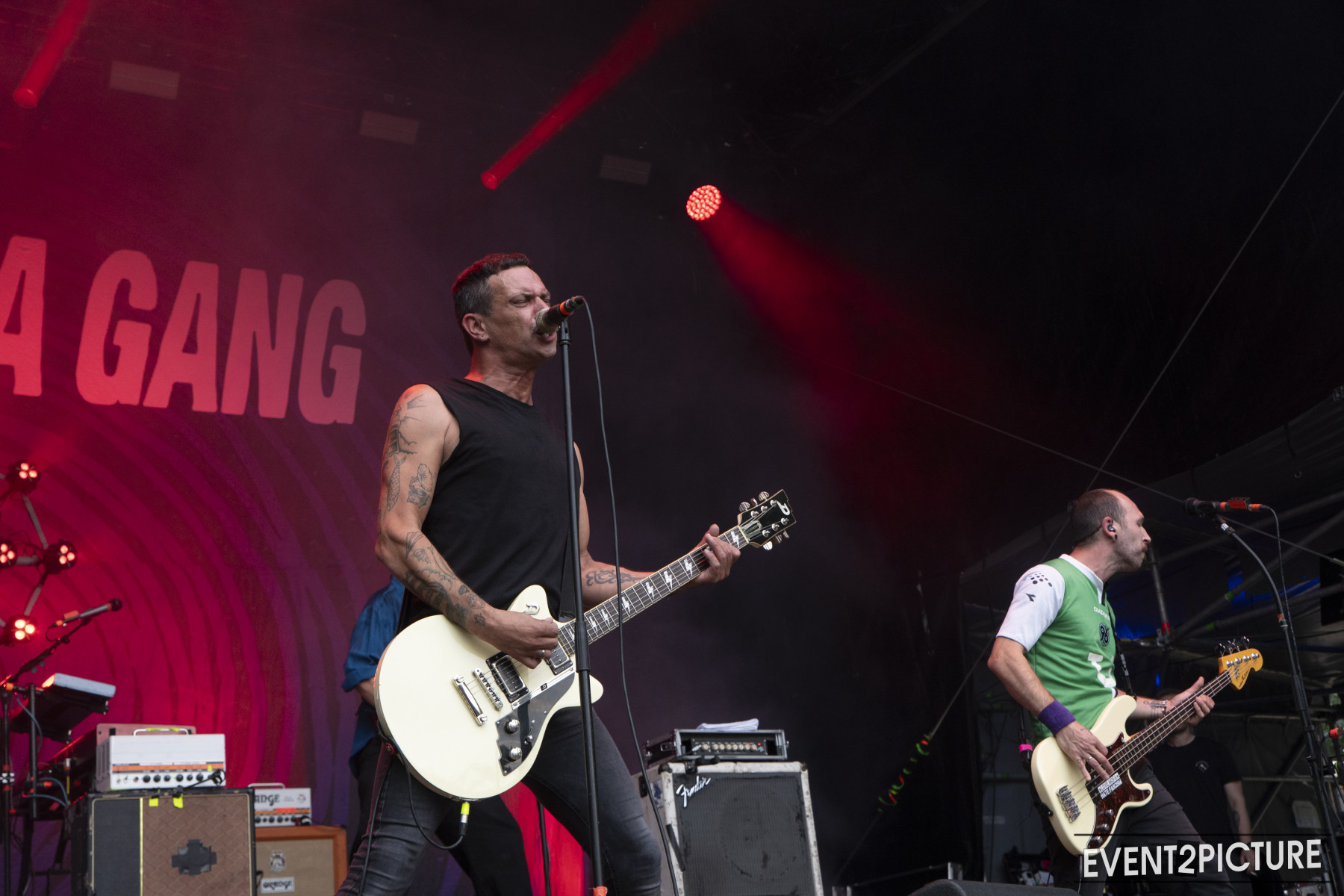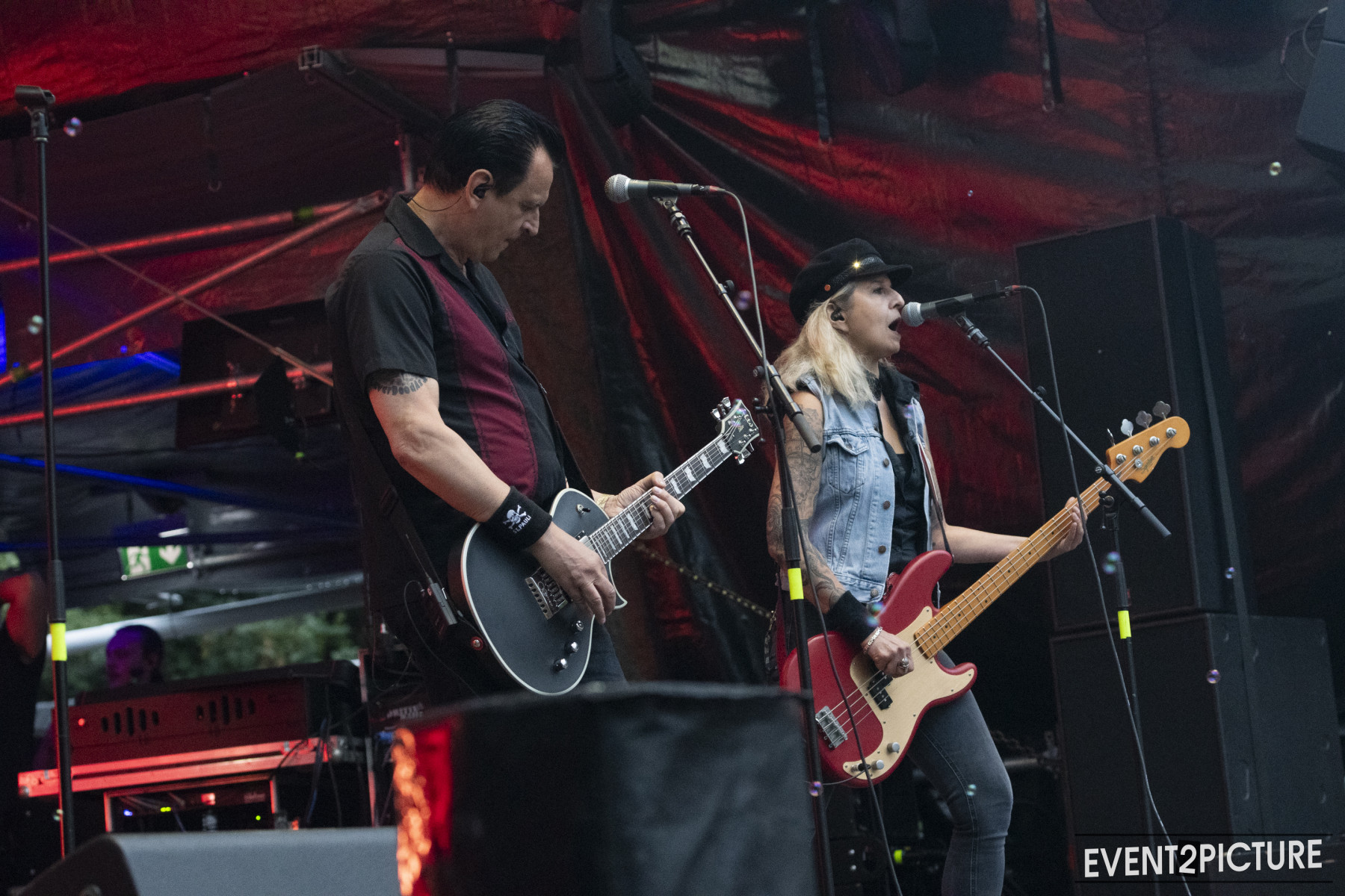 Den musikalischen Start übernimmt das Kölner Frauenquartett The Red Flags. Ihr Girlgroup-Grunge klingt rau und direkt, getragen von einem klaren Rhythmusfundament. Trotz des strömenden Regens bleiben die ersten Reihen dicht besetzt. In den Umbaupausen sorgt Uli Sailor am Punkrock-Piano für Unterhaltung – eigentlich auf einer kleinen Freiluftbühne geplant, zieht er wetterbedingt ins Zelt um und spielt dort vor dicht gedrängtem Publikum.