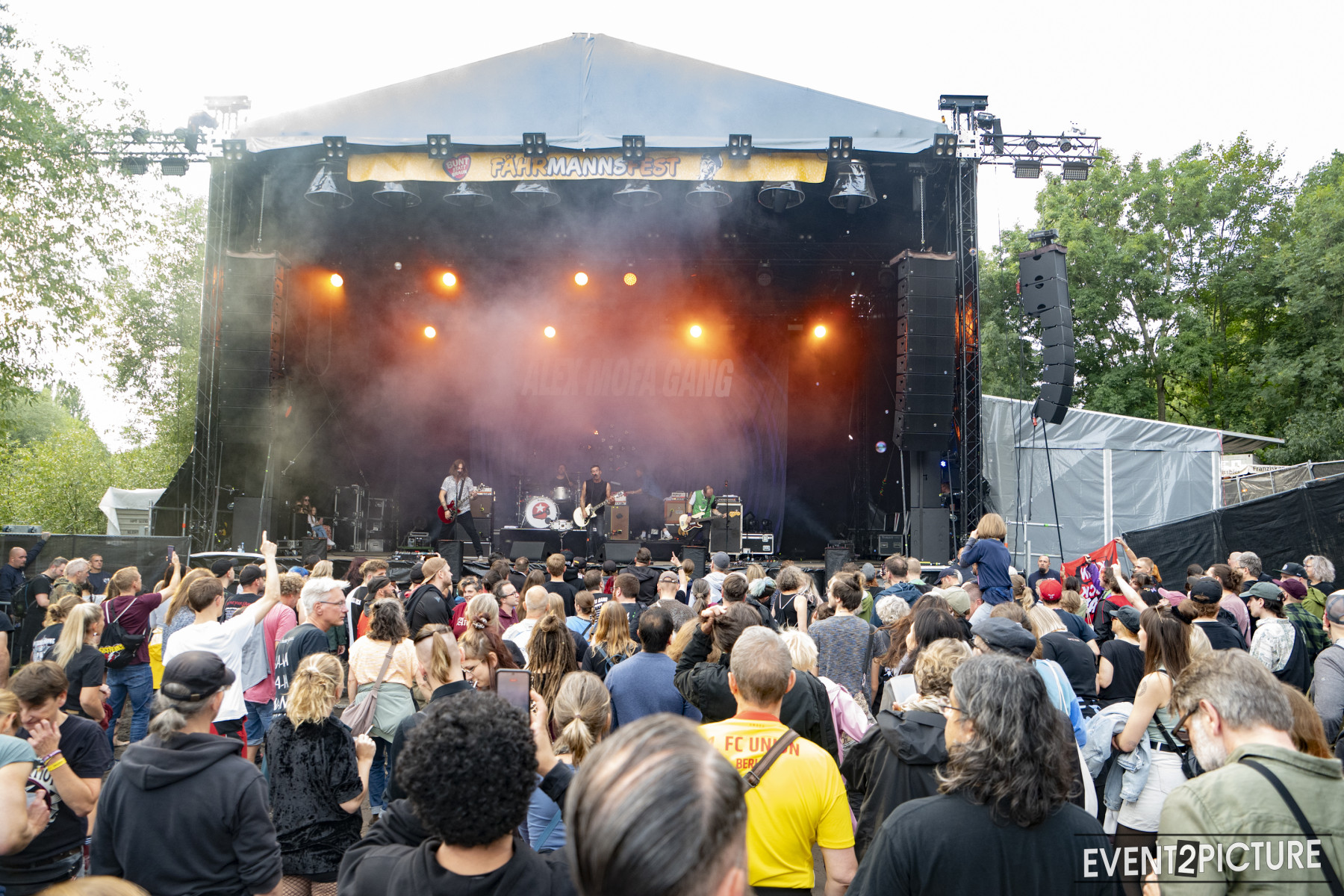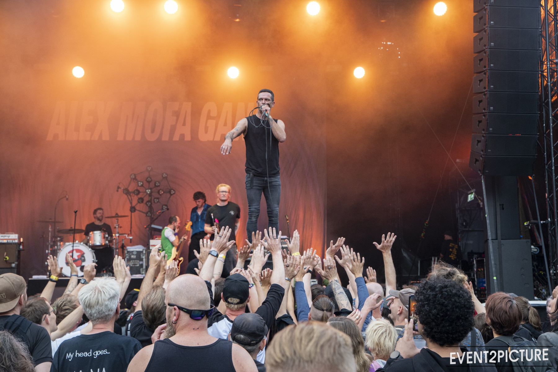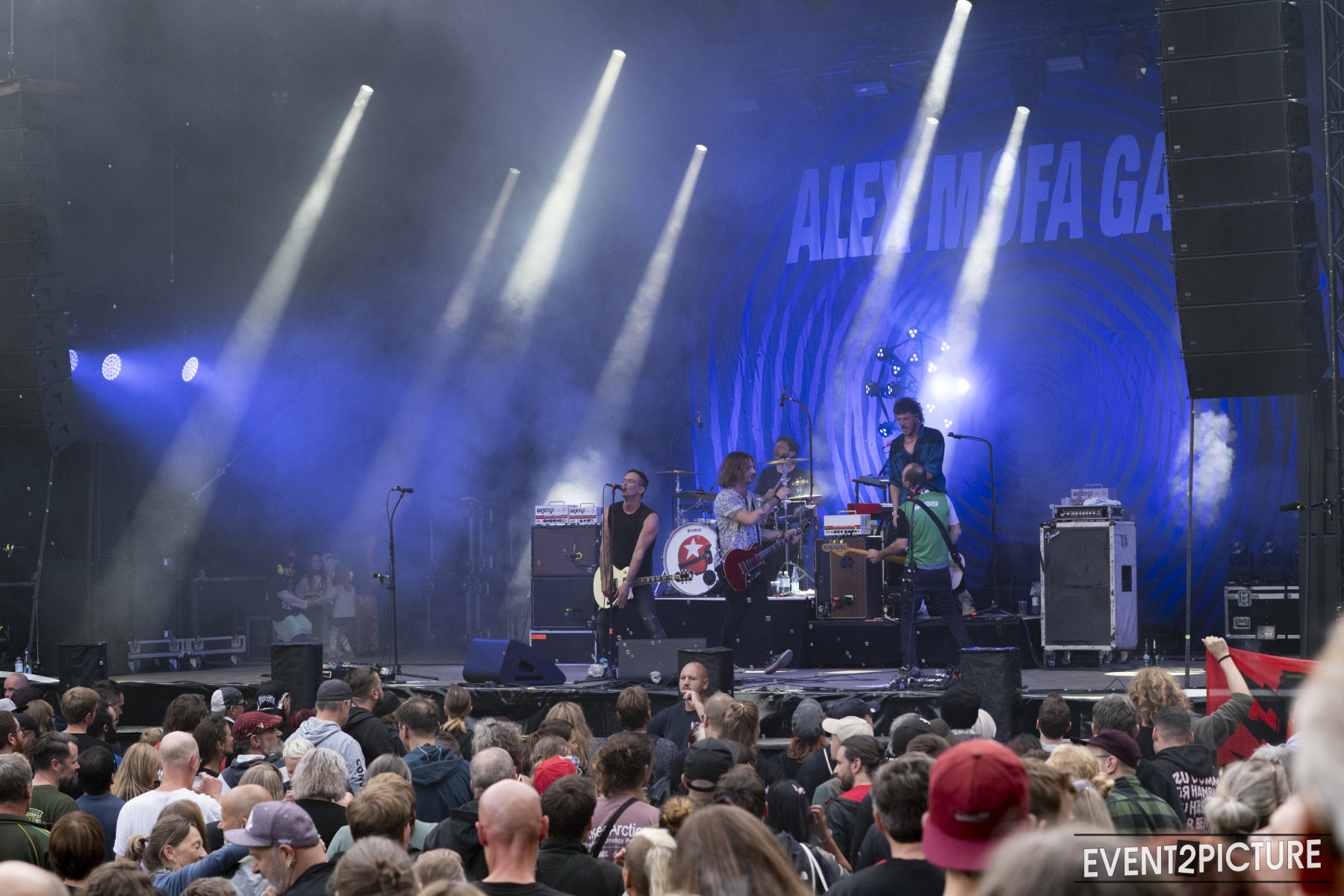 Die Alex Mofa Gang greift mit „Kein Land in Sicht“ ernste Themen auf und führt das Set in eine Coverversion von Bosses „Frankfurt/Oder“, unterstützt von Bela Lehnhardt von Wisecräcker an der Trompete. Das Zusammenspiel verleiht dem Song einen zusätzlichen Farbtupfer und wird vom Publikum entsprechend aufgenommen.