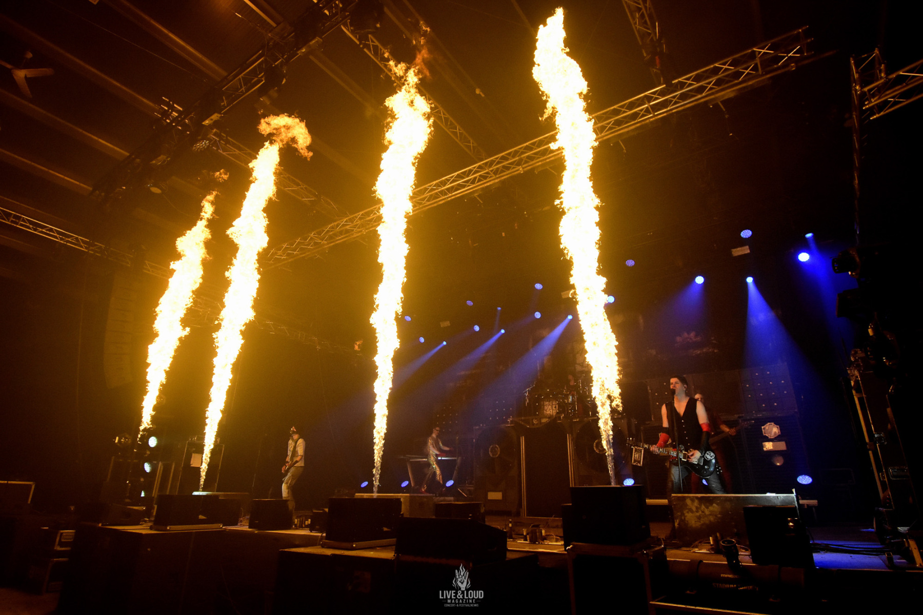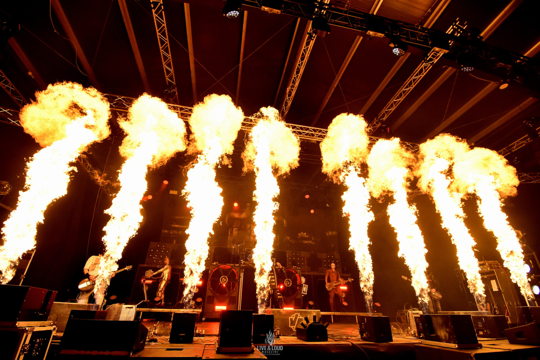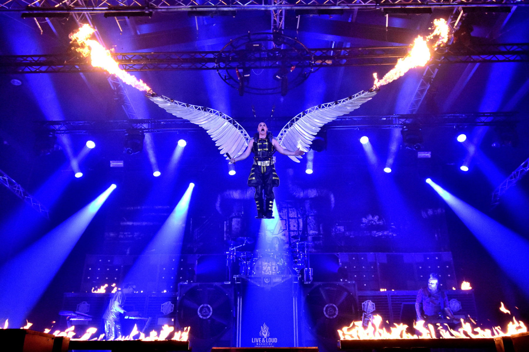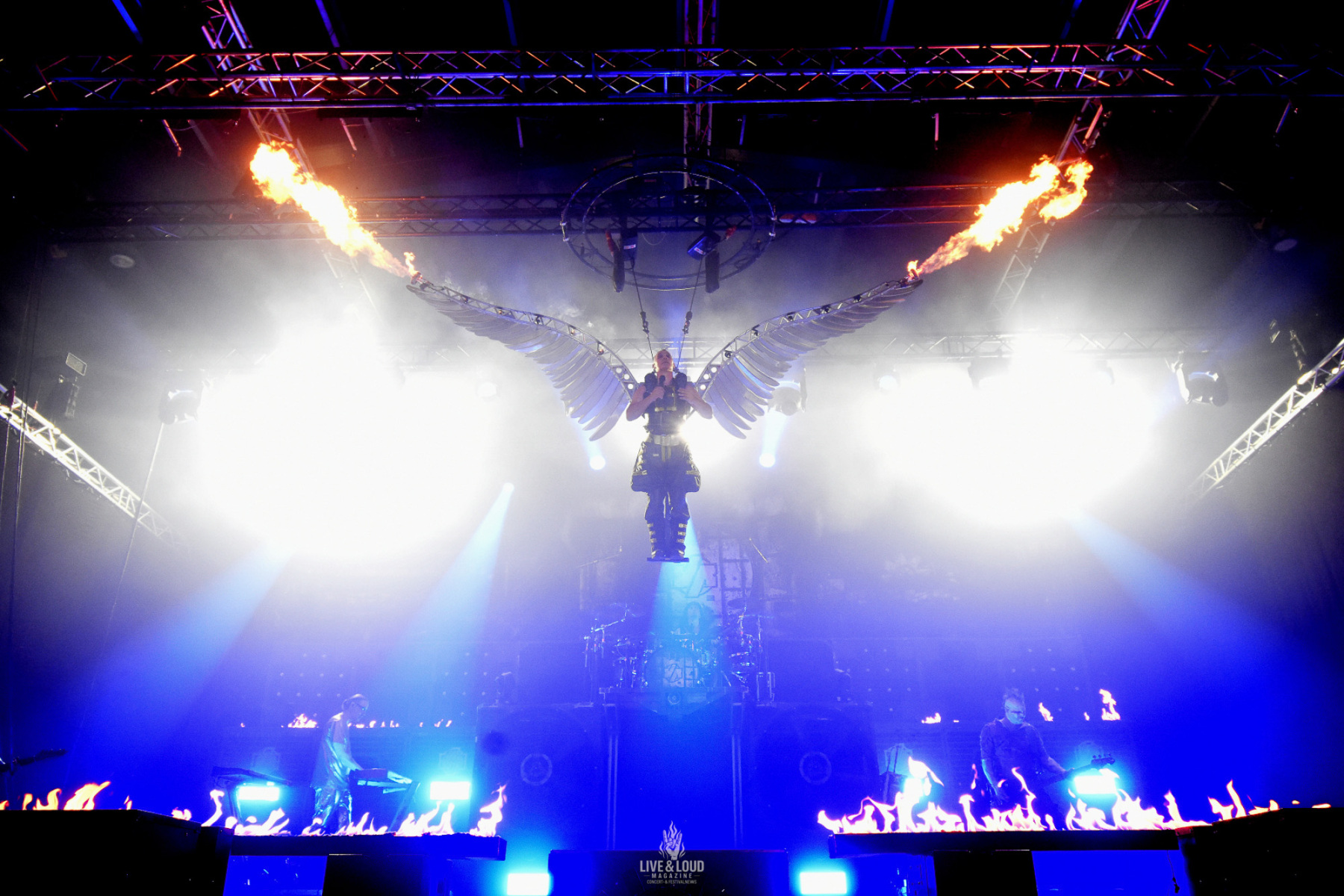Gleichzeitig bleibt die Show in Bewegung. Die „Engel“-Szenerie funktioniert nicht als bloßer Effekt, sondern als fester Bestandteil des Ablaufs. Wenn sich der Frontmann mit Flügeln in die Höhe erhebt, ist das kein Zirkusmoment, sondern sauber eingebaut und logisch innerhalb der Dramaturgie des Sets.