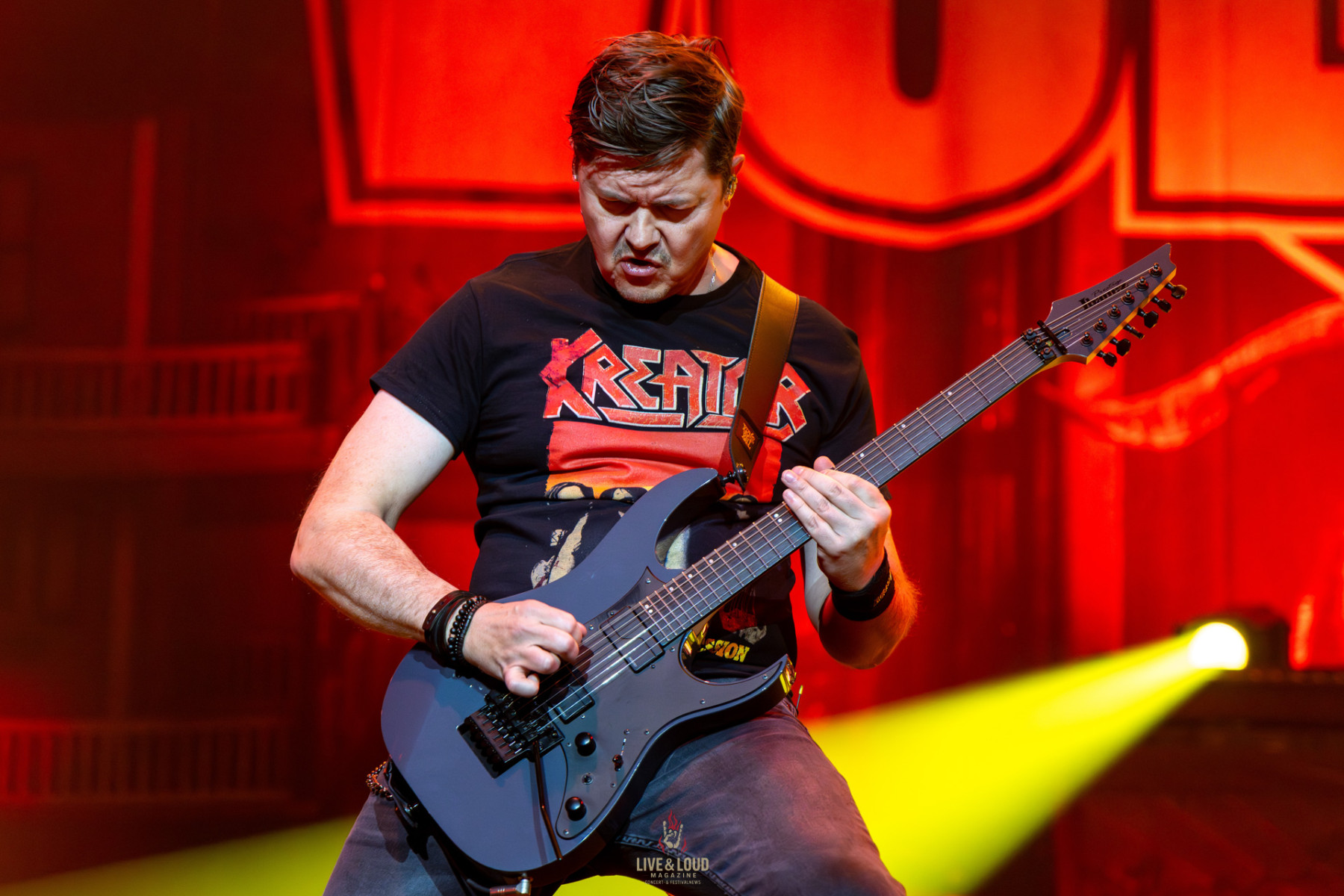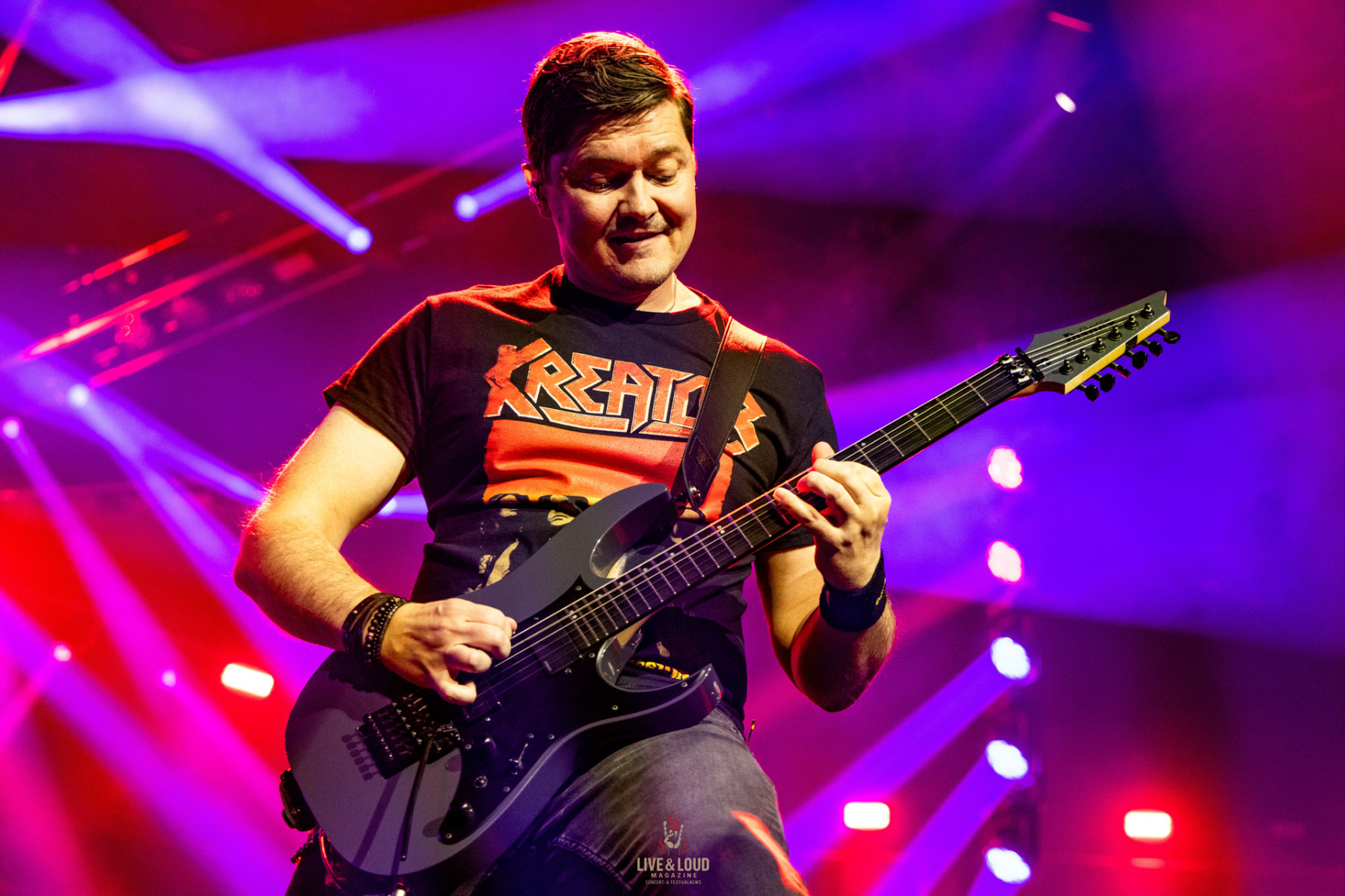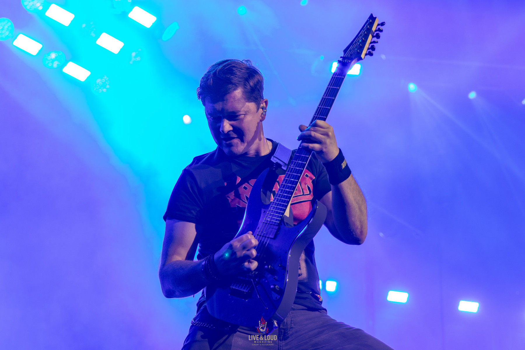 Düsterer wird es mit Demonic Depression, einem der zentralen Titel des neuen Albums. Schwere Riffs, dunkle Harmonien und rotes Licht formen ein dichtes Klangbild. Bassist Kasper Boye Larsen steht breitbeinig im Rampenlicht, während Flemming C. Lund präzise Gitarrenläufe setzt.