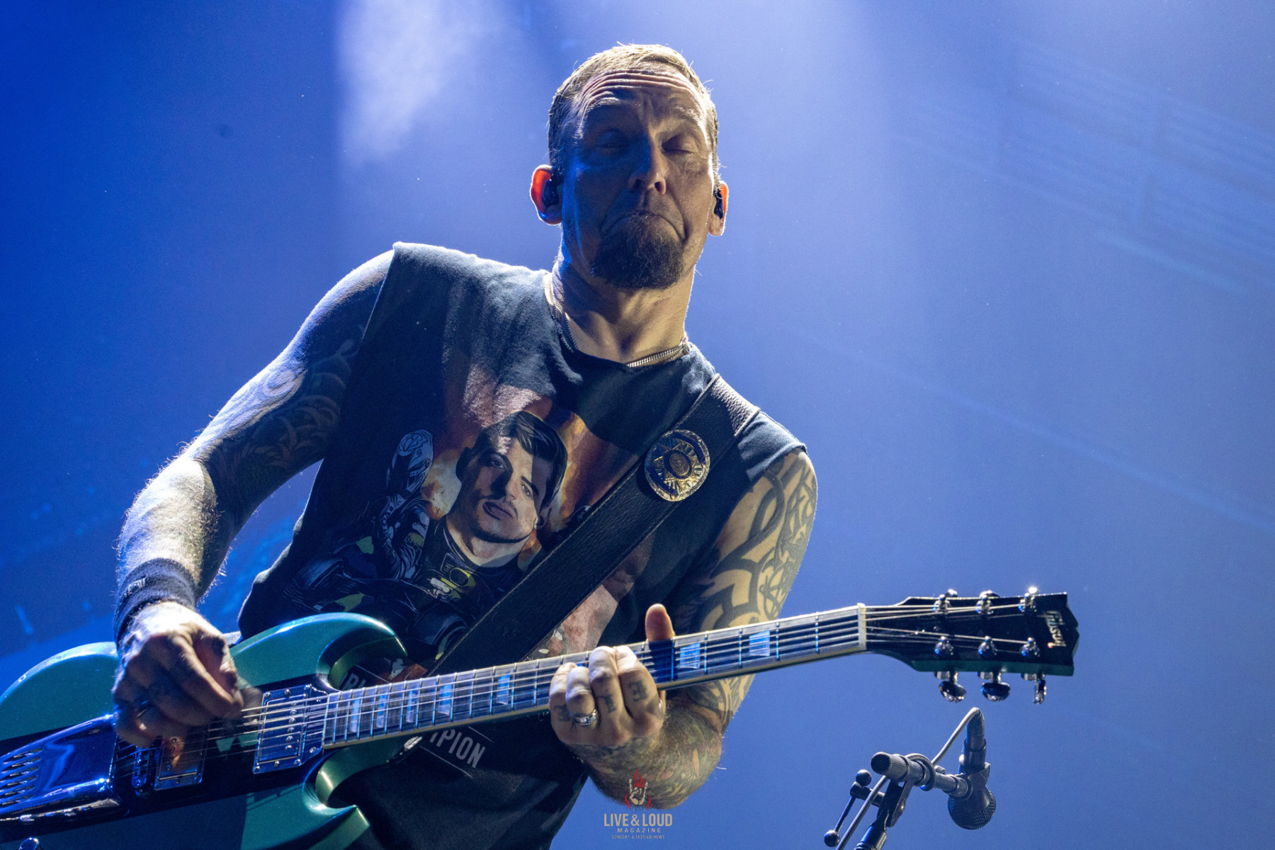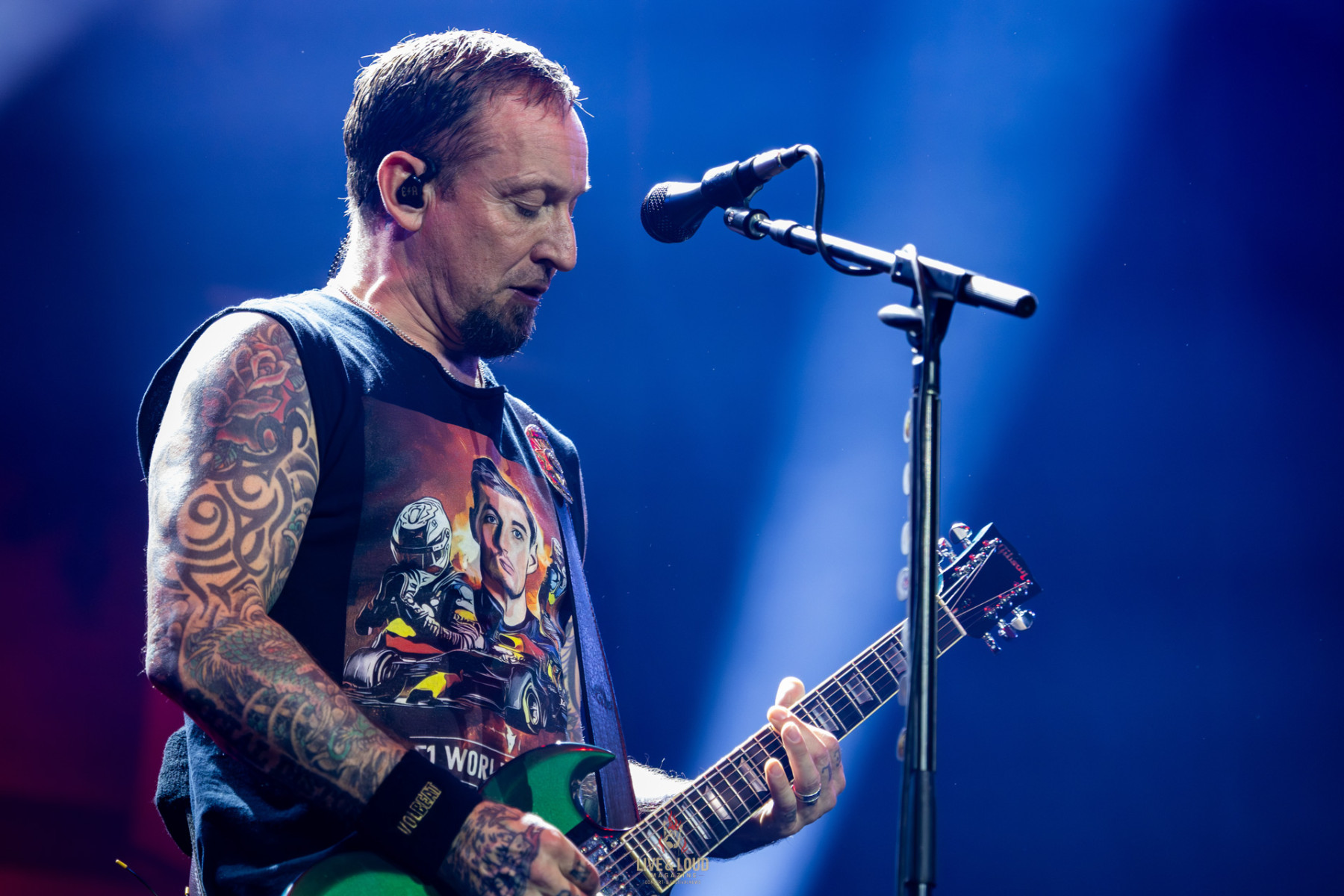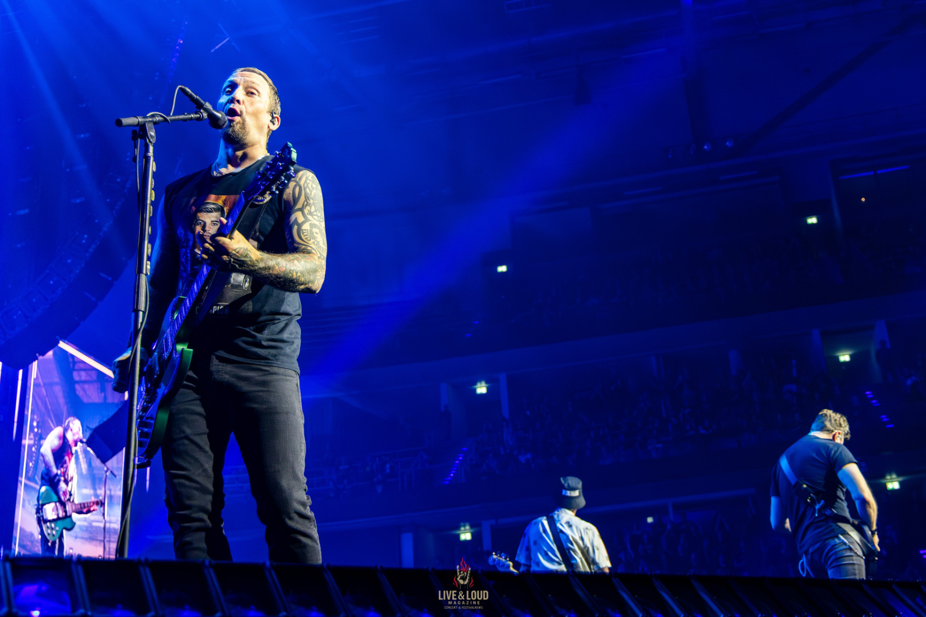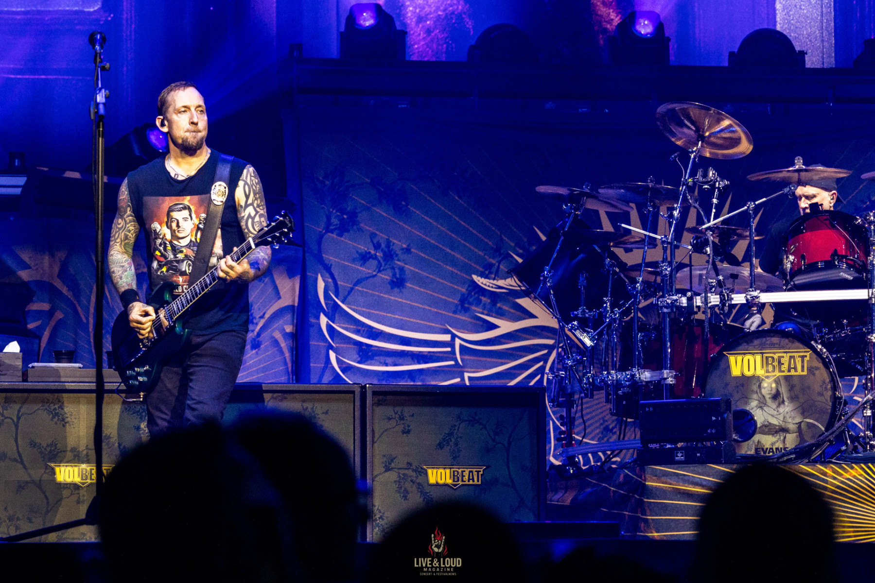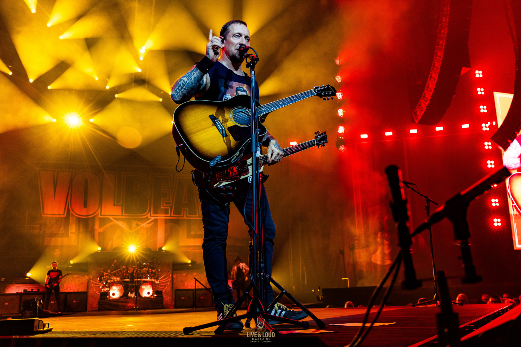 Um 21:05 Uhr verdunkelt sich die Arena. Ein bedrohliches Intro ertönt, die Spannung steigt – und als der Vorhang fällt, bricht der Jubel los. Volbeat stürmen auf die Bühne, und mit The Devil’s Bleeding Crown ist das Feuer sofort entfacht. Der Sound ist druckvoll und klar, die Instrumente perfekt ausbalanciert, Michael Poulsens Stimme markant wie eh und je.