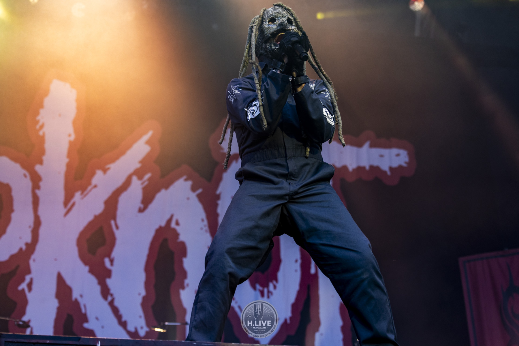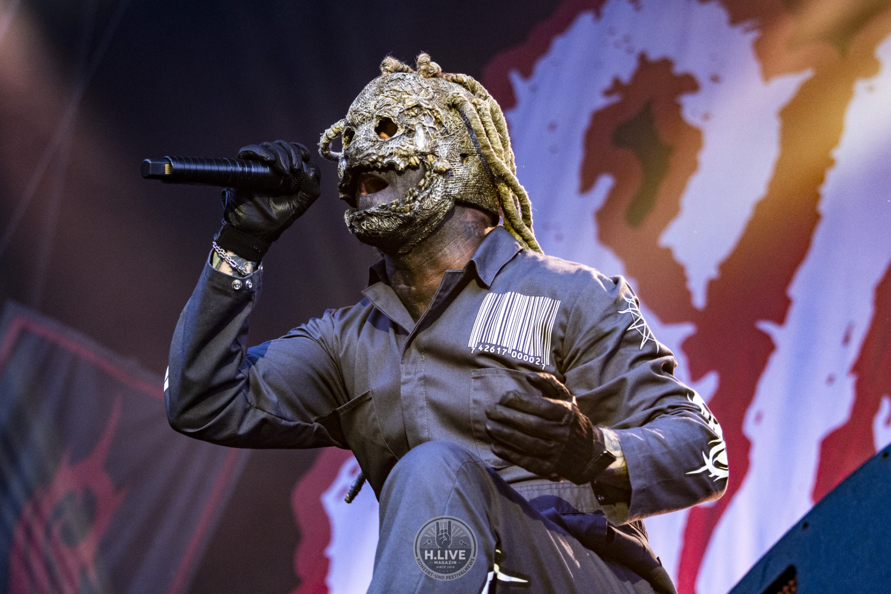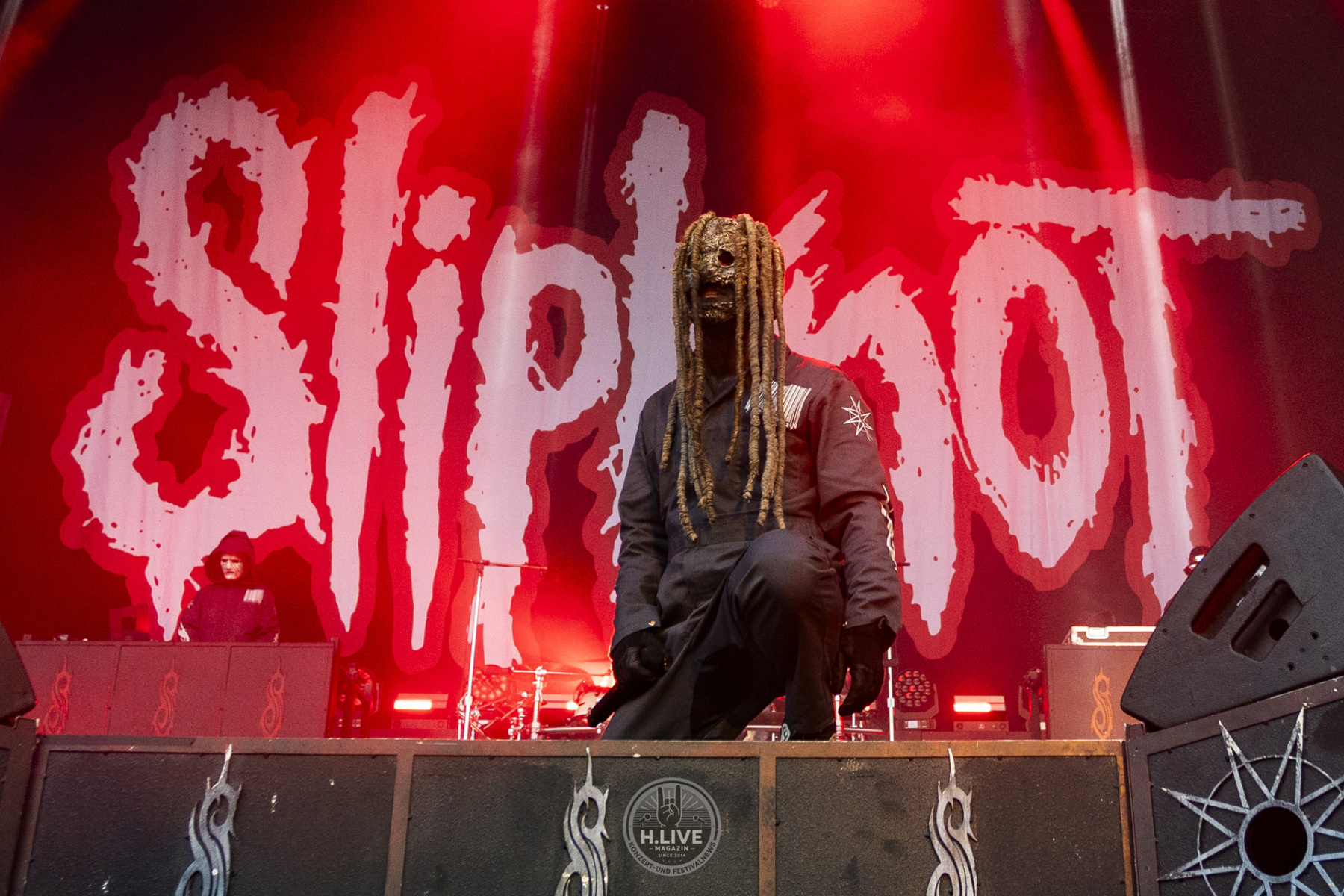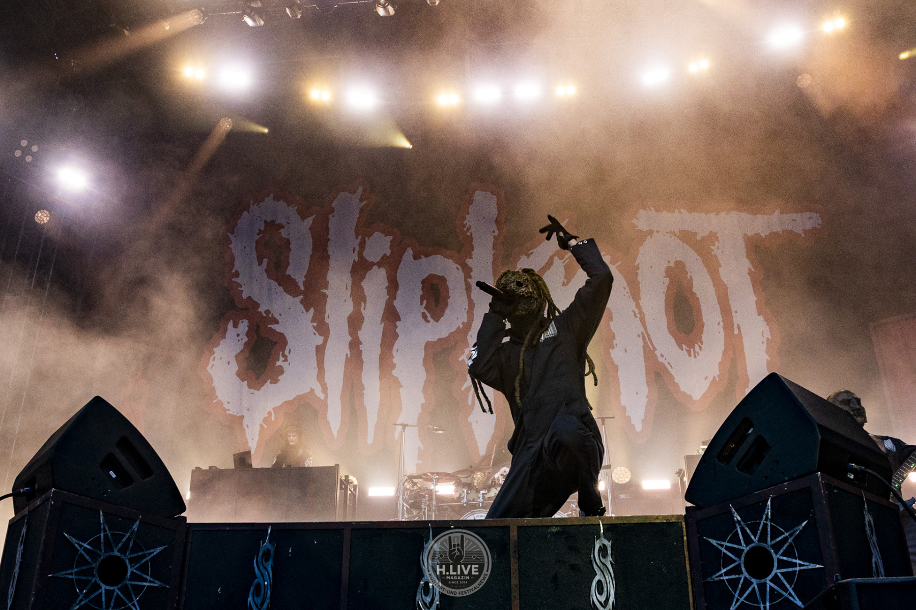 Ohne Vorhang, ohne Pyro, ohne Showstart mit Effekt: Slipknot kamen einfach raus und machten ernst. Nach dem augenzwinkernden TV-Intro mit dem „Knight Rider Theme“ und dem düsteren Tape „742617000027“ legten sie um 20:15 Uhr los – ohne Vorwarnung, ohne Warm-up-Phase. Der Opener „(sic)“ schnitt direkt ins Set. Und das Publikum? Mitten drin.