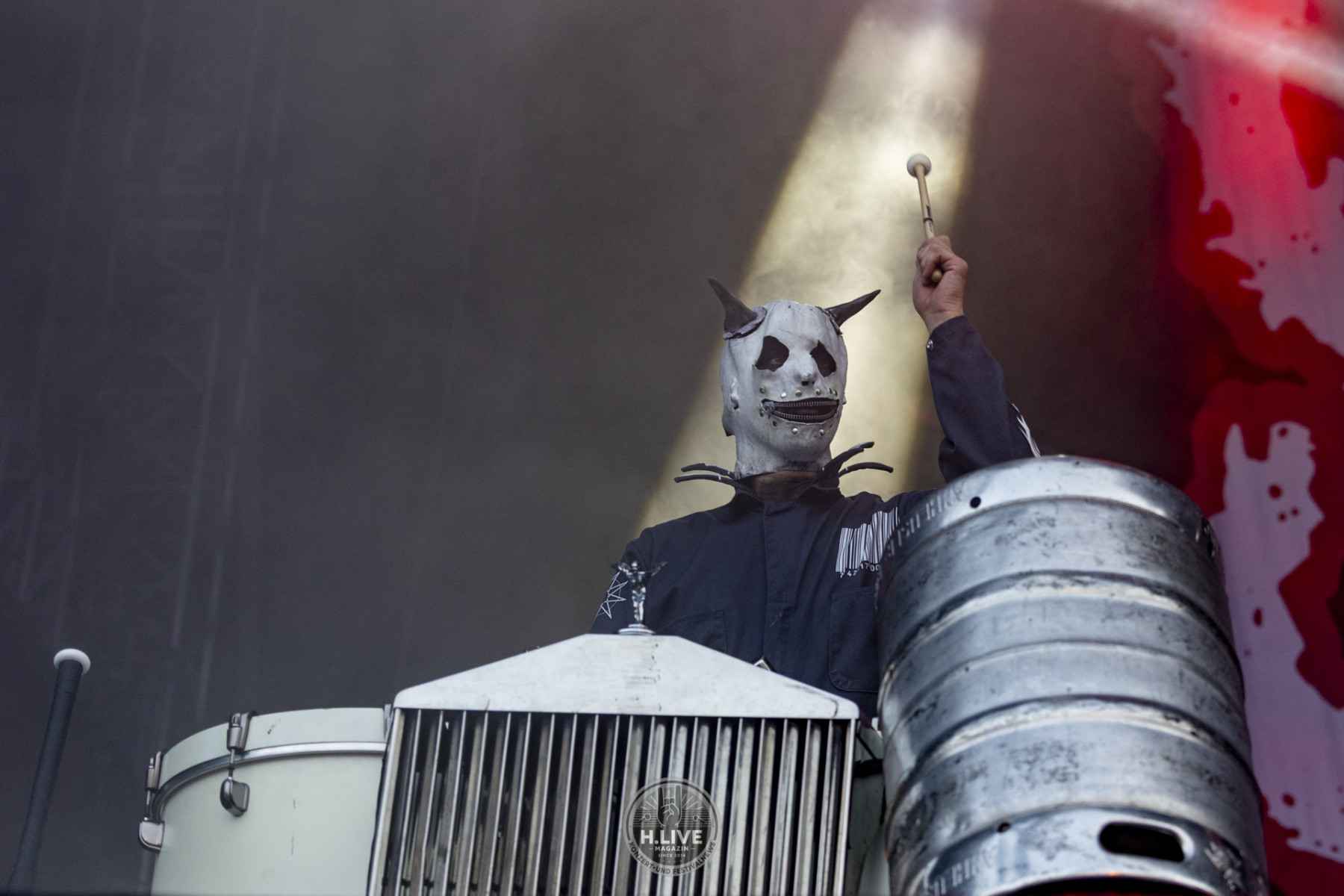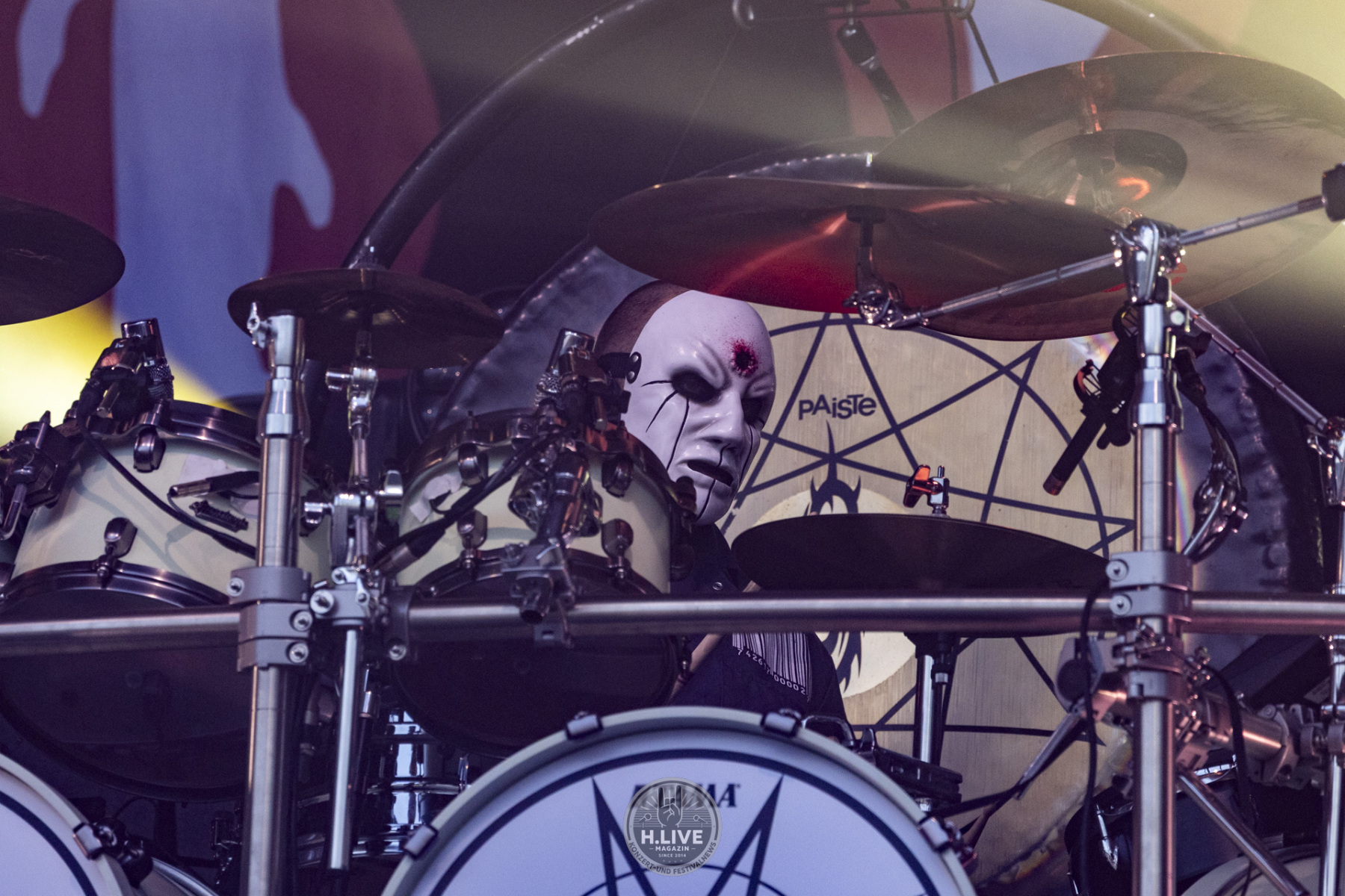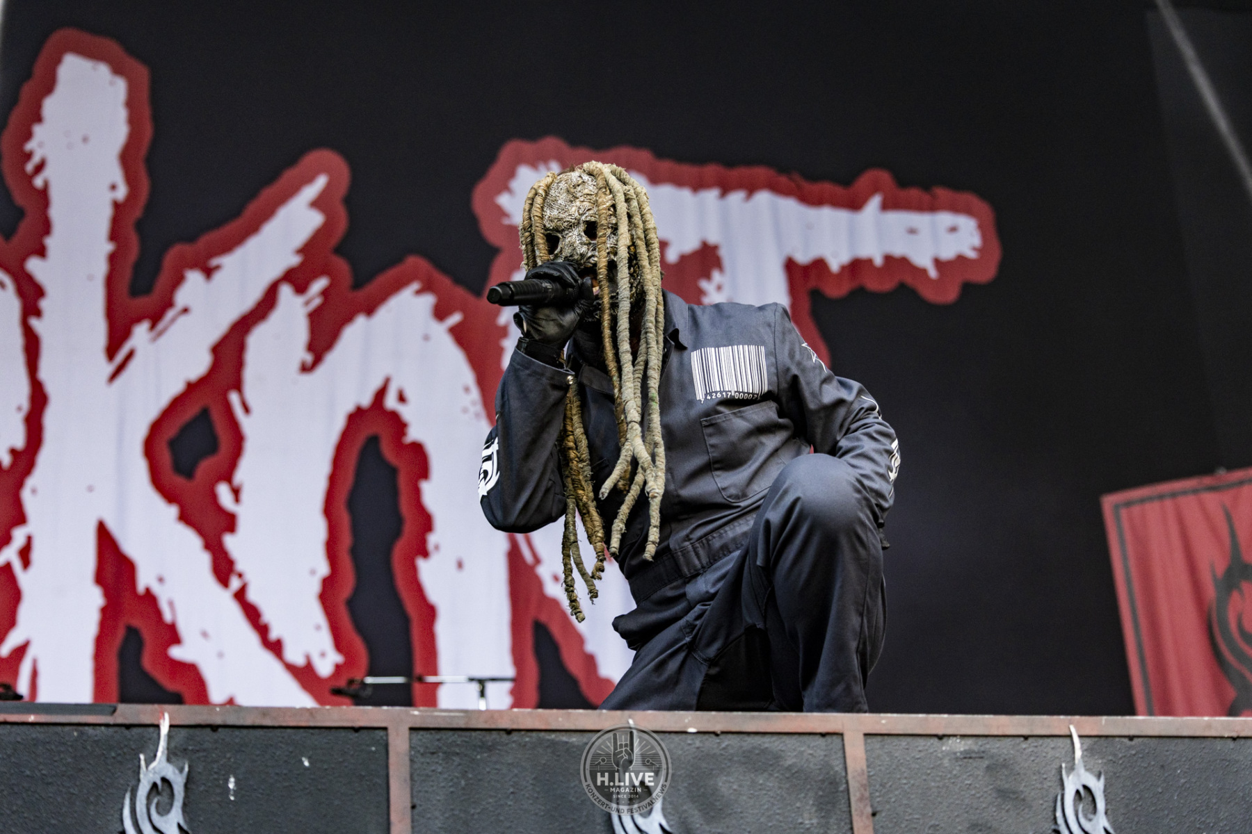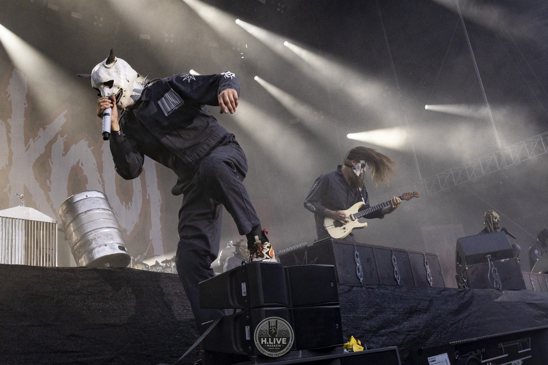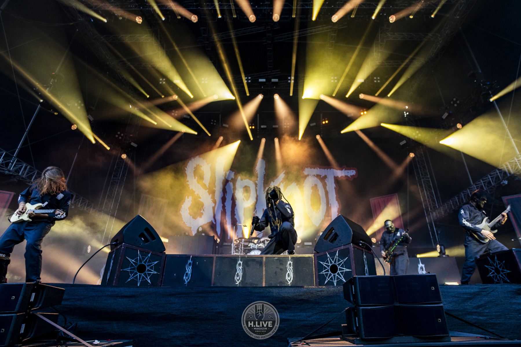 Ohne Vorhang, ohne Pyro, ohne Showstart mit Effekt: Slipknot kamen einfach raus und machten ernst. Nach dem augenzwinkernden TV-Intro mit dem „Knight Rider Theme“ und dem düsteren Tape „742617000027“ legten sie um 20:15 Uhr los – ohne Vorwarnung, ohne Warm-up-Phase. Der Opener „(sic)“ schnitt direkt ins Set. Und das Publikum? Mitten drin.