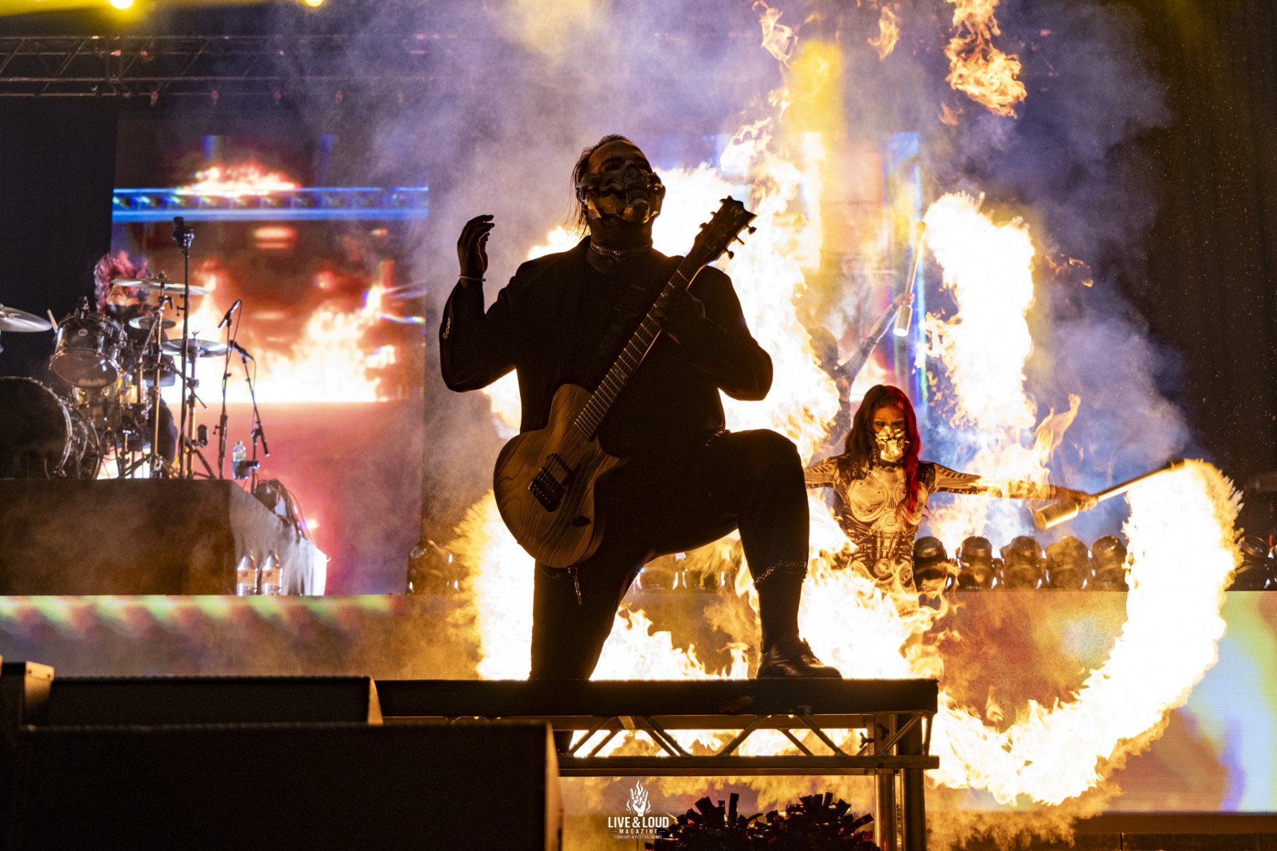 Ein zentraler Aspekt, der diesen Abend prägte, war der massive Einsatz von Pyrotechnik. Bei Motionless in White in Hannover 2026 war das Feuer kein bloßer Showeffekt, sondern ein rhythmisches Instrument. Die Flammenwerfer waren so präzise auf die Breakdowns und die rhythmischen Akzente der Band abgestimmt, dass sie die ohnehin schon enorme Energie der Songs physisch greifbar machten. Die Hitze, die bis in die hintersten Reihen der Halle drang, wirkte wie ein Katalysator für die Stimmung im Raum. Es war die visuelle Entsprechung zu der inneren Zerrissenheit und der Wut, die viele der Texte von Chris Motionless thematisieren.