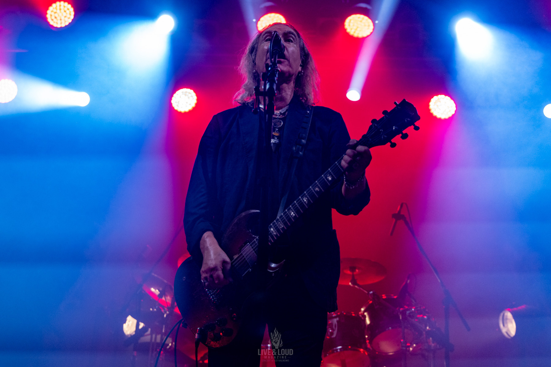Justin Sullivan prägt den Abend durch Genauigkeit statt Theatralik. Seine Präsenz entsteht aus Timing, Artikulation und einem Gitarrenspiel, das Rhythmus und Akzent zugleich liefert. In den ruhigeren Momenten liegt die Kraft im Atem der Phrasen; in dichteren Passagen wird die Stimme zum zusätzlichen perkussiven Element. Diese klare Linie trägt durch den Abend und verankert die Band in einer Haltung zur Arbeit: spielen, nicht demonstrieren; fokussieren, nicht überfrachten. Genau deshalb bleiben selbst vertraute Nummern frisch – sie werden nicht im Format konserviert, sondern im Moment gezeichnet.