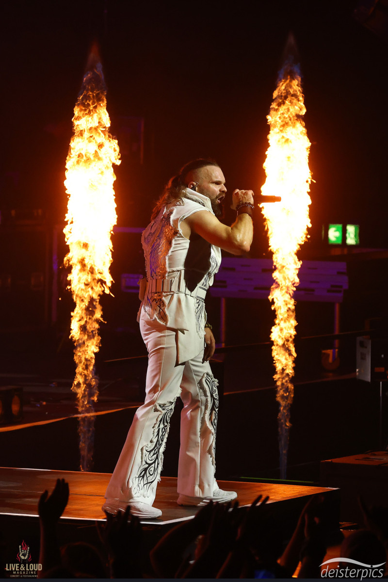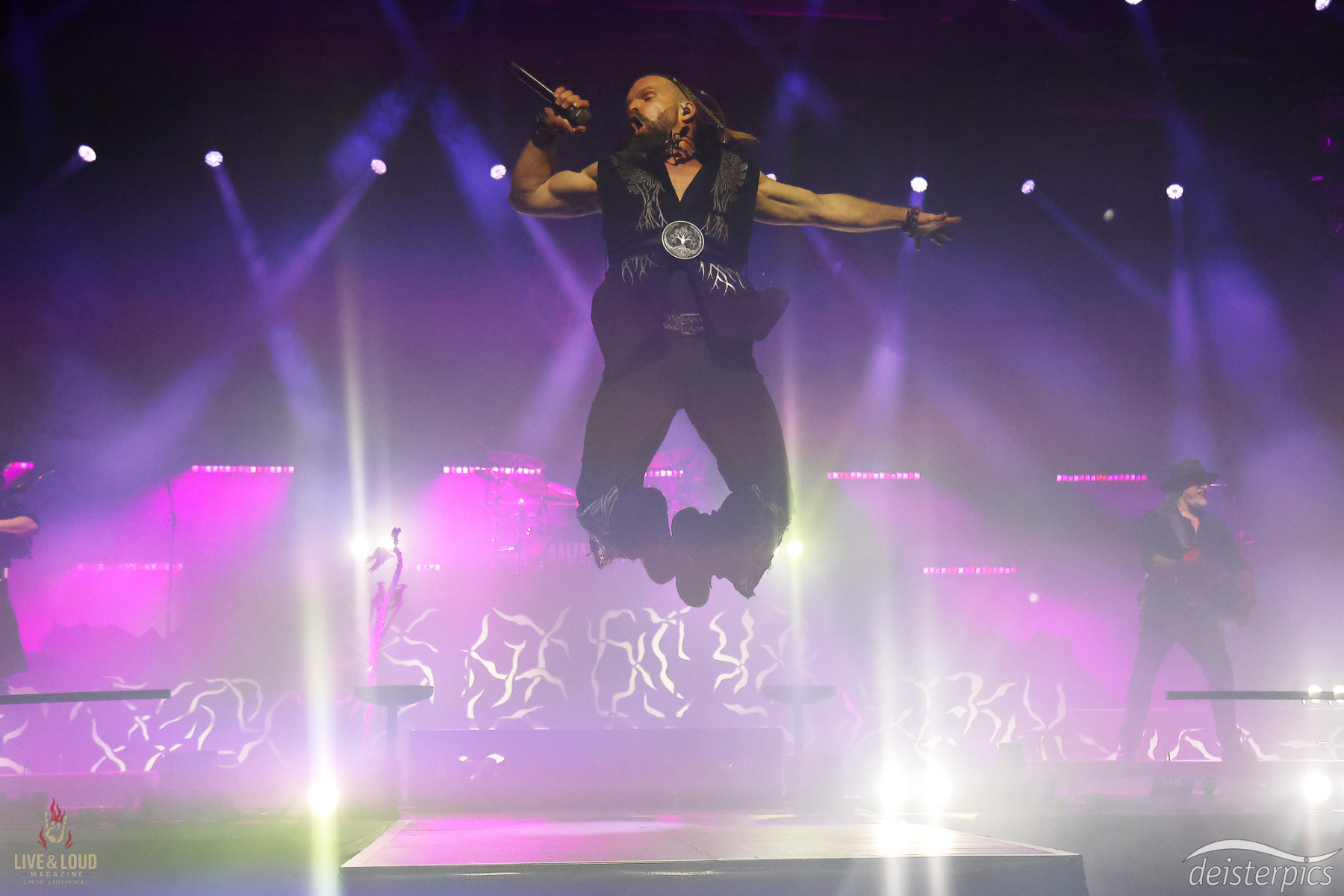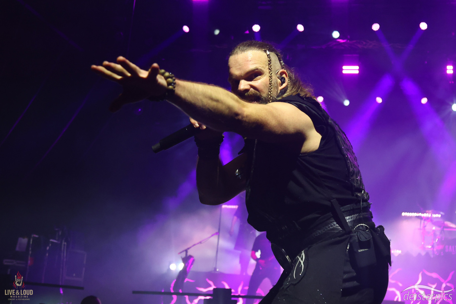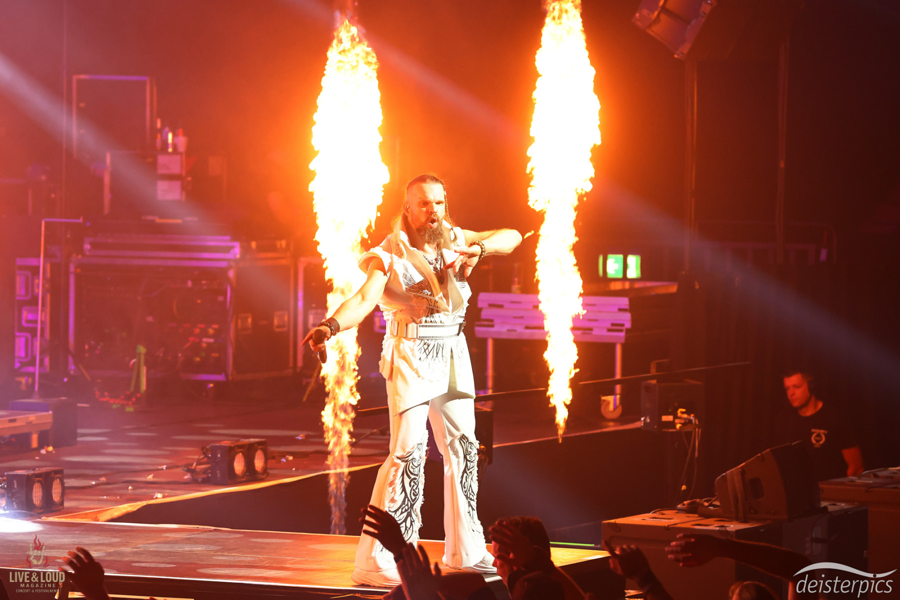 Bei „Feuer und Erz“ stand Alea als Druide im Zentrum, umgeben von Rauch, Licht und Sound – eine Szene, die so intensiv war, dass das Publikum den Atem anhielt. Kurz darauf folgte „Valhalla Calling“, ein Stück, das sich zu einer wahren Hymne steigerte.