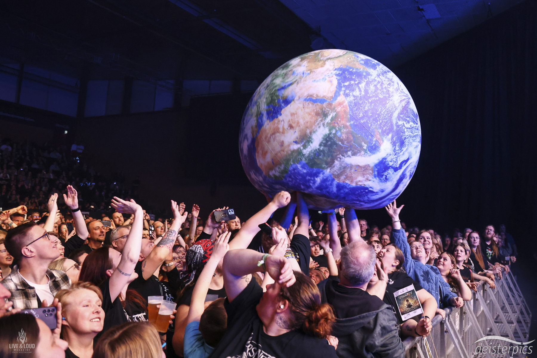 Ein prägnanter Moment entsteht, als ein großer Globus seinen Weg von der Bühne ins Publikum findet. Anfangs noch unkoordiniert, entwickelt sich schnell ein gemeinsamer Rhythmus. Die Kugel bewegt sich über die Menge hinweg, getragen von vielen Händen.