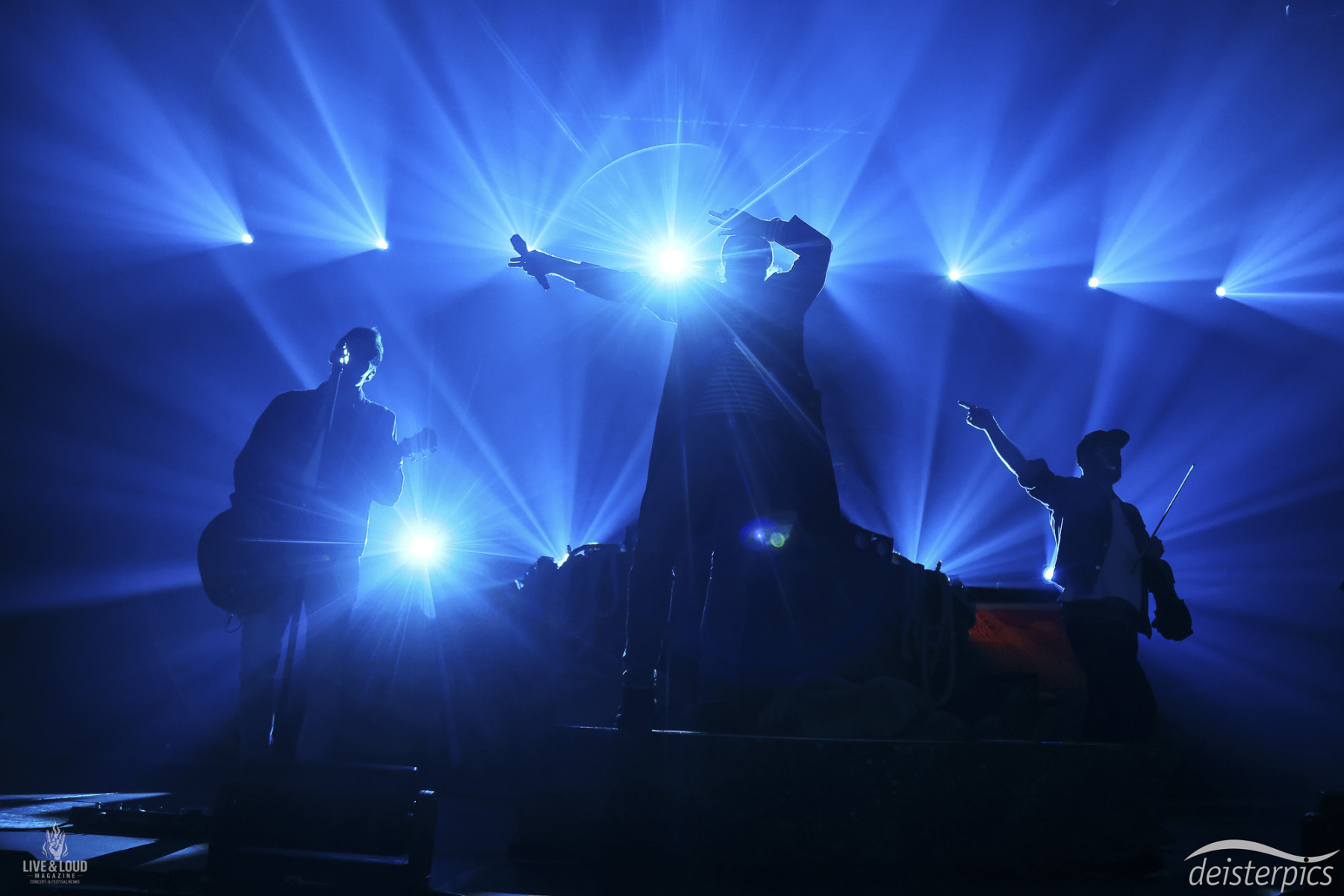 Während die Musik einsetzt, ist die Band zunächst nur zu erahnen. Bewegungen hinter dem Vorhang, Licht, das sich langsam aufbaut. Erst mit dem Öffnen der Bühne wird das Gesamtbild sichtbar.