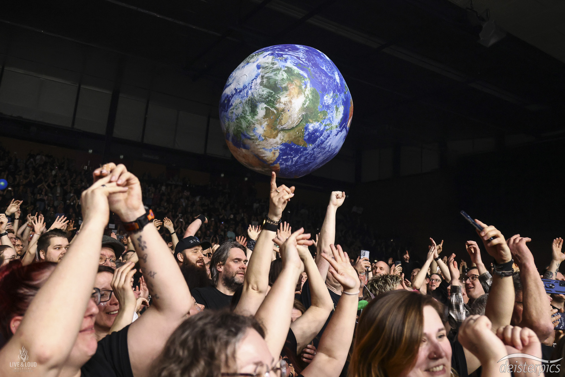 Ein prägnanter Moment entsteht, als ein großer Globus seinen Weg von der Bühne ins Publikum findet. Anfangs noch unkoordiniert, entwickelt sich schnell ein gemeinsamer Rhythmus. Die Kugel bewegt sich über die Menge hinweg, getragen von vielen Händen.