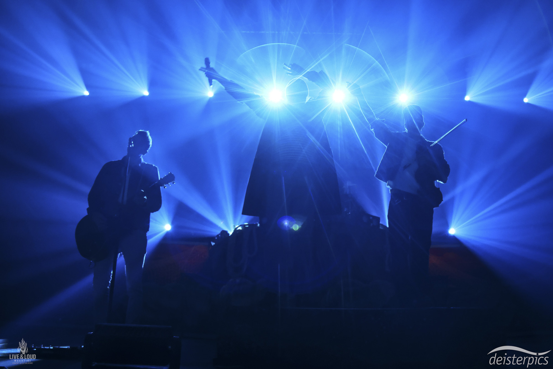 Während die Musik einsetzt, ist die Band zunächst nur zu erahnen. Bewegungen hinter dem Vorhang, Licht, das sich langsam aufbaut. Erst mit dem Öffnen der Bühne wird das Gesamtbild sichtbar.
