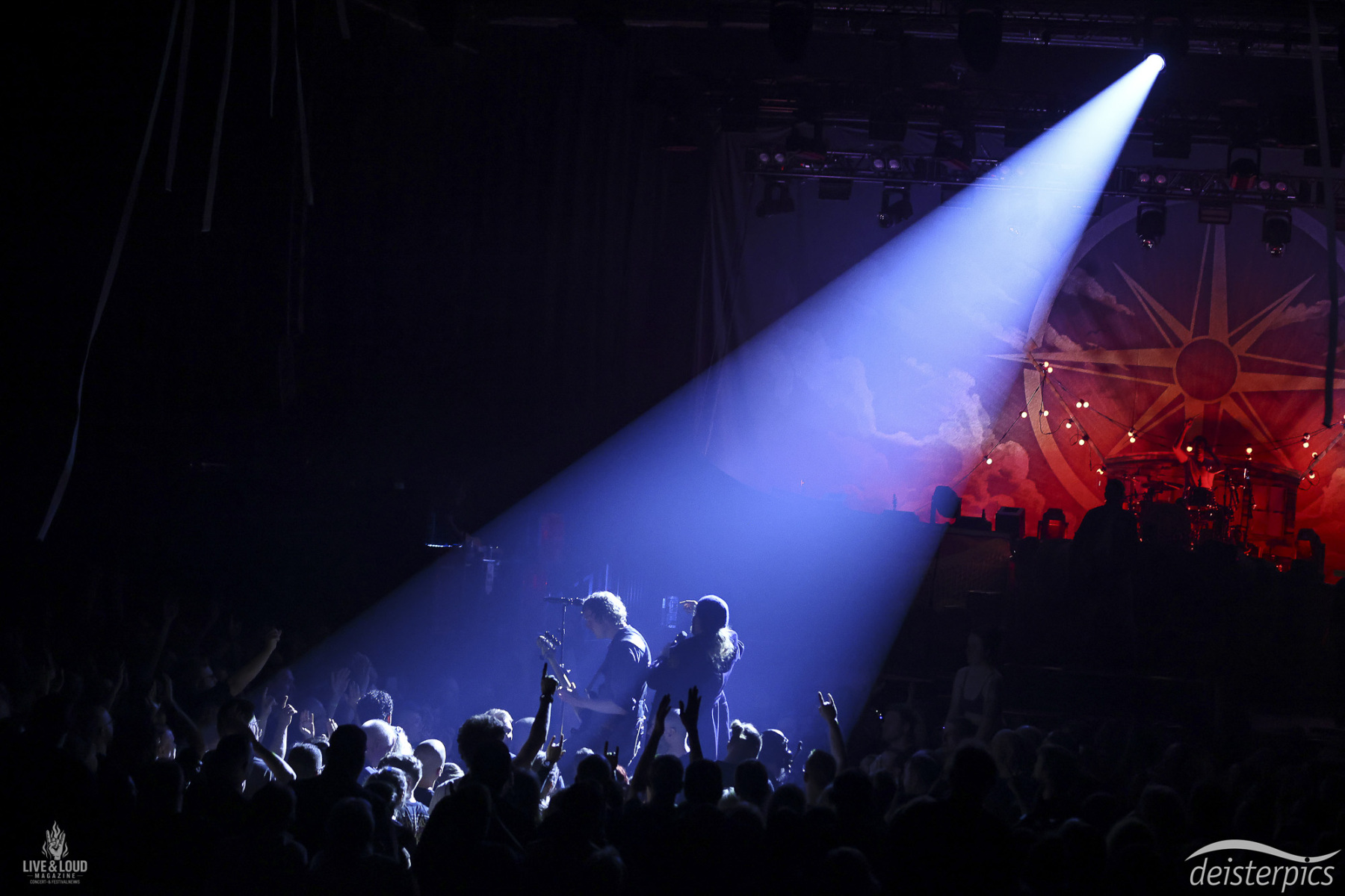 Ein zentraler Punkt entsteht, als die Band die große Bühne verlässt und sich ins Publikum begibt. Auf einer kleineren Fläche im hinteren Teil der Halle entsteht eine völlig andere Situation.