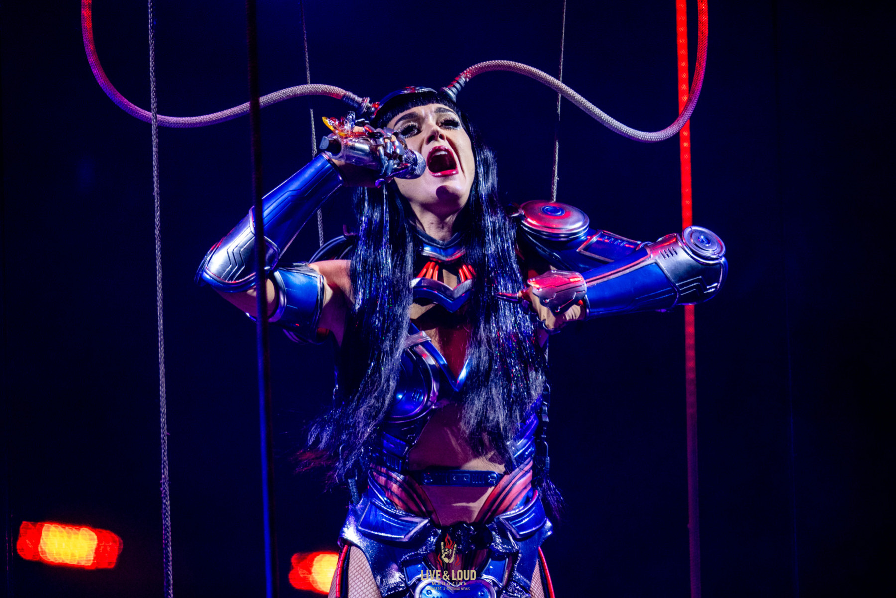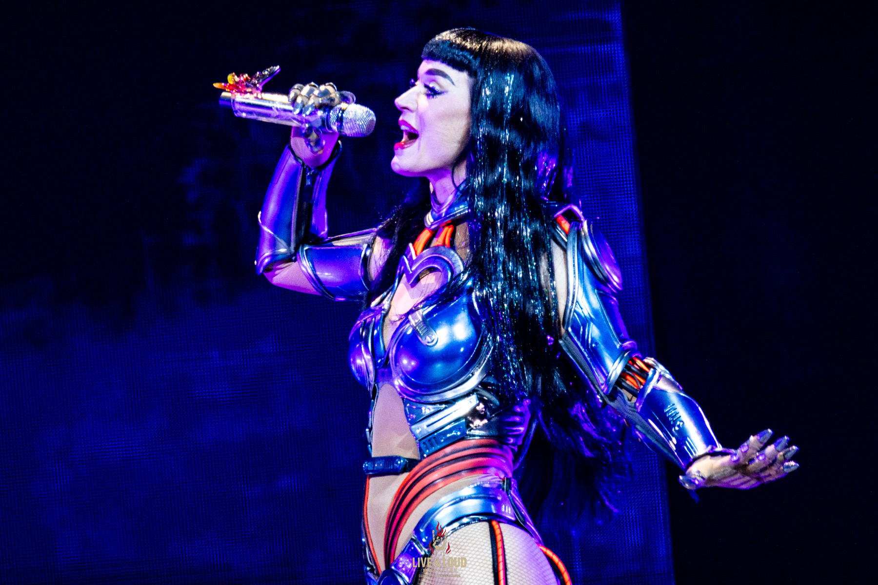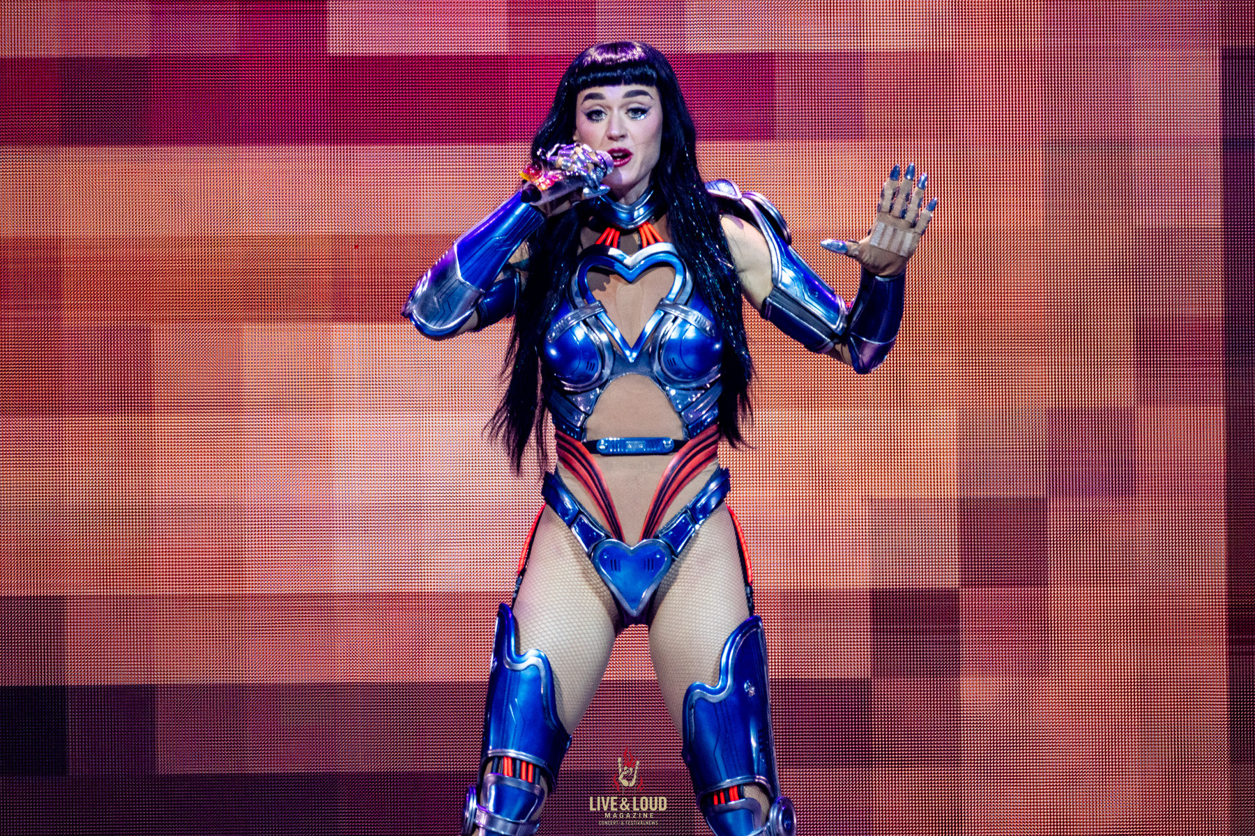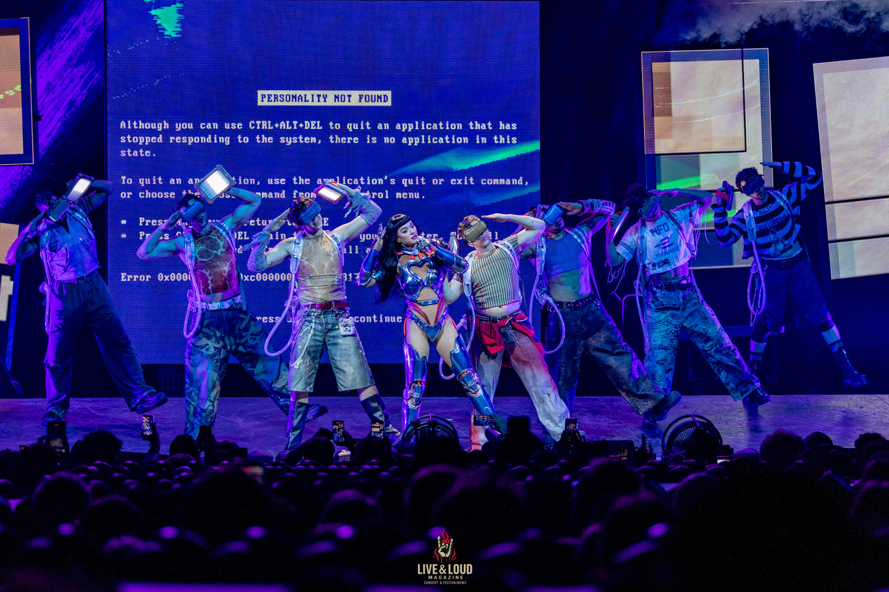 Das Konzept: Perry verkörpert den Cyborg „KP143“, halb Mensch, halb Maschine, die in einer dystopischen Welt gegen ein übermächtiges KI-System namens Mainframe kämpft. Was zunächst wie ein loses Narrativ wirkt, entpuppt sich als roter Faden des Abends – eine moderne Popoper in mehreren Akten, in der Perry die Grenzen von Technologie und Emotion auslotet.