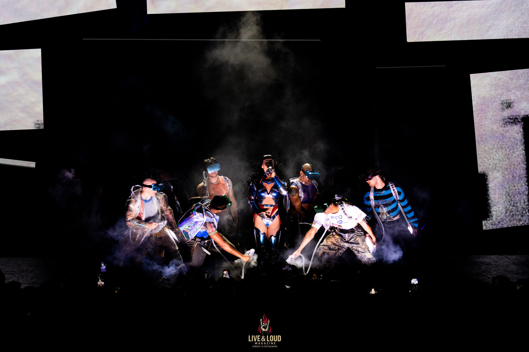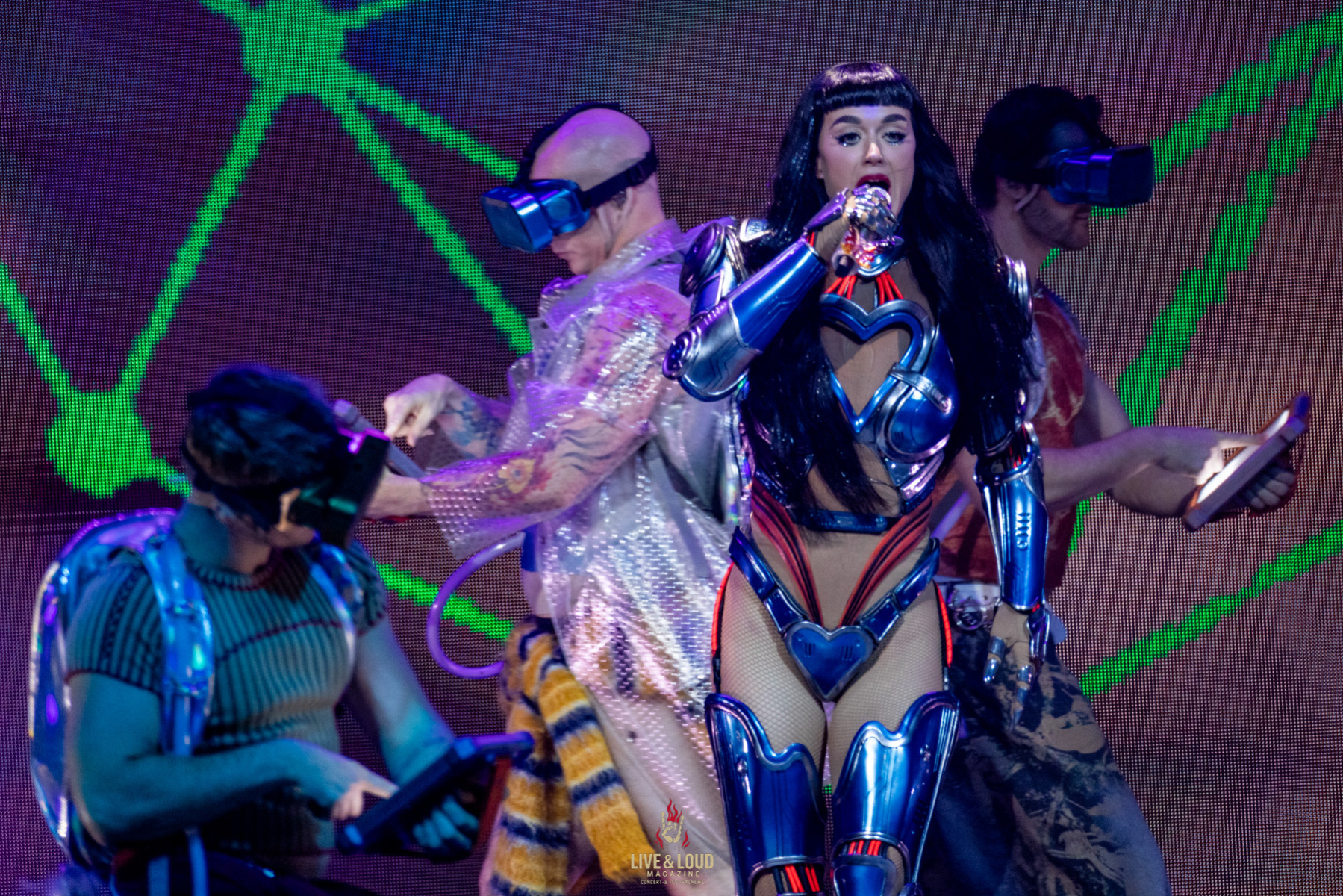 Perry startet die Show mitten in der Halle. Aus der Bühnenmitte steigt sie in die Höhe, umgeben von Lichtspiralen – ein Auftakt zwischen Science-Fiction und Showbiz. Artificial, Chained to the Rhythm und Teary Eyes eröffnen das Konzert mit pulsierendem Elektropop und choreografischer Präzision.