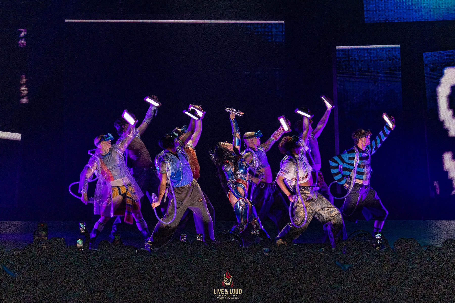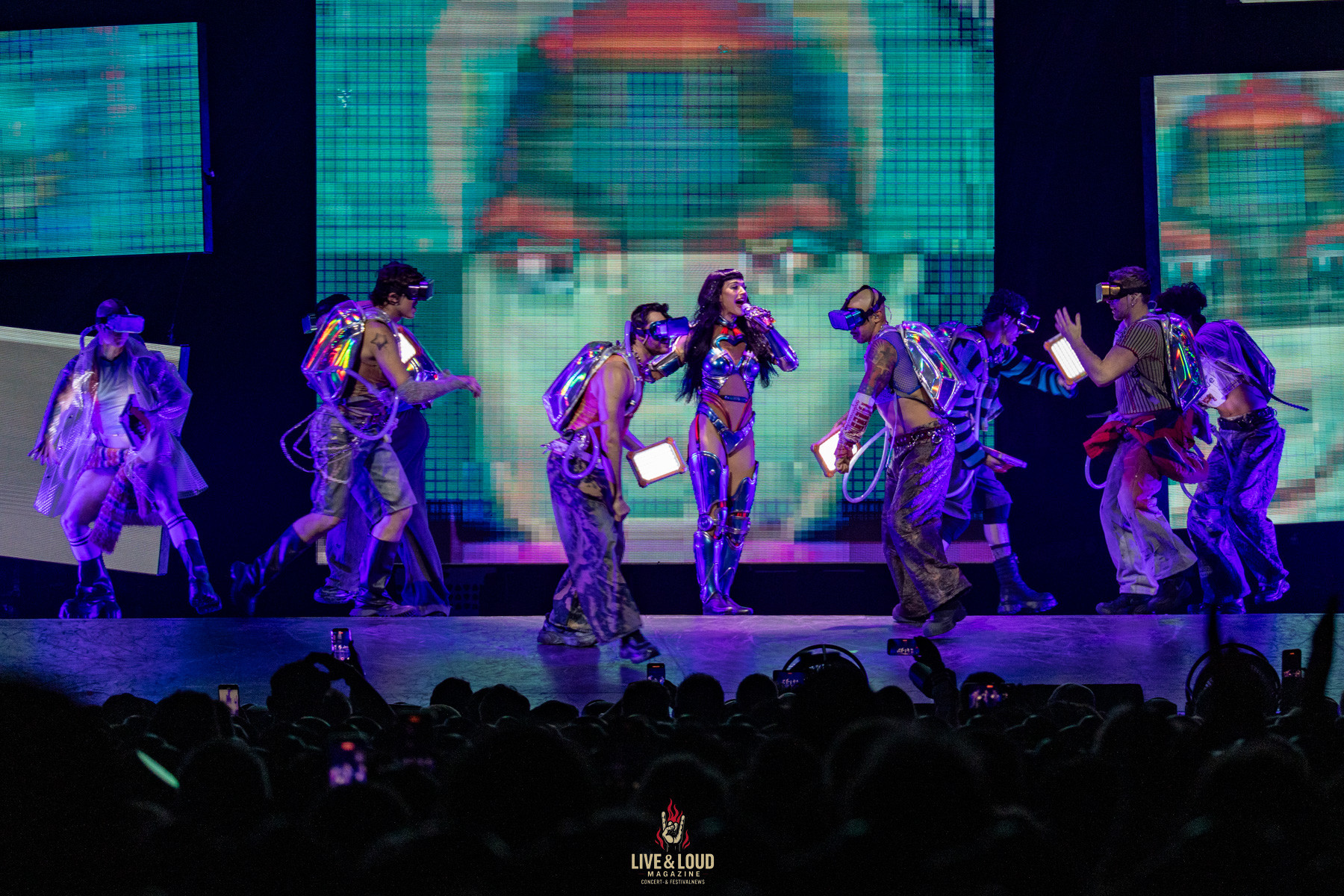 Die Bühne lebt, alles bewegt sich. Lichter fließen, Projektionen pulsieren, Tänzerinnen in Chromkostümen wirbeln durch ein digitales Labyrinth. Das Publikum weiß kaum, wohin es zuerst sehen soll – und genau das ist der Effekt: totale Überforderung als Stilmittel.